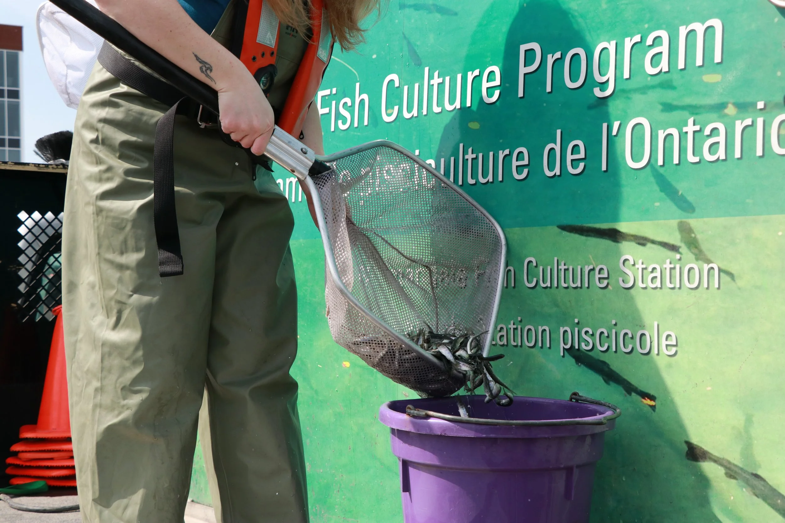 Every spring, we receive 50 to 60 thousand salmon fry from the Normandale fish hatchery, which are administered from the Lake Ontario Management Unit (MNR). Upon receiving the fish, they are quickly bucketed into large net-pens located in the Dalhousie harbour, where they will stay and grow for 4 to 6 weeks.
